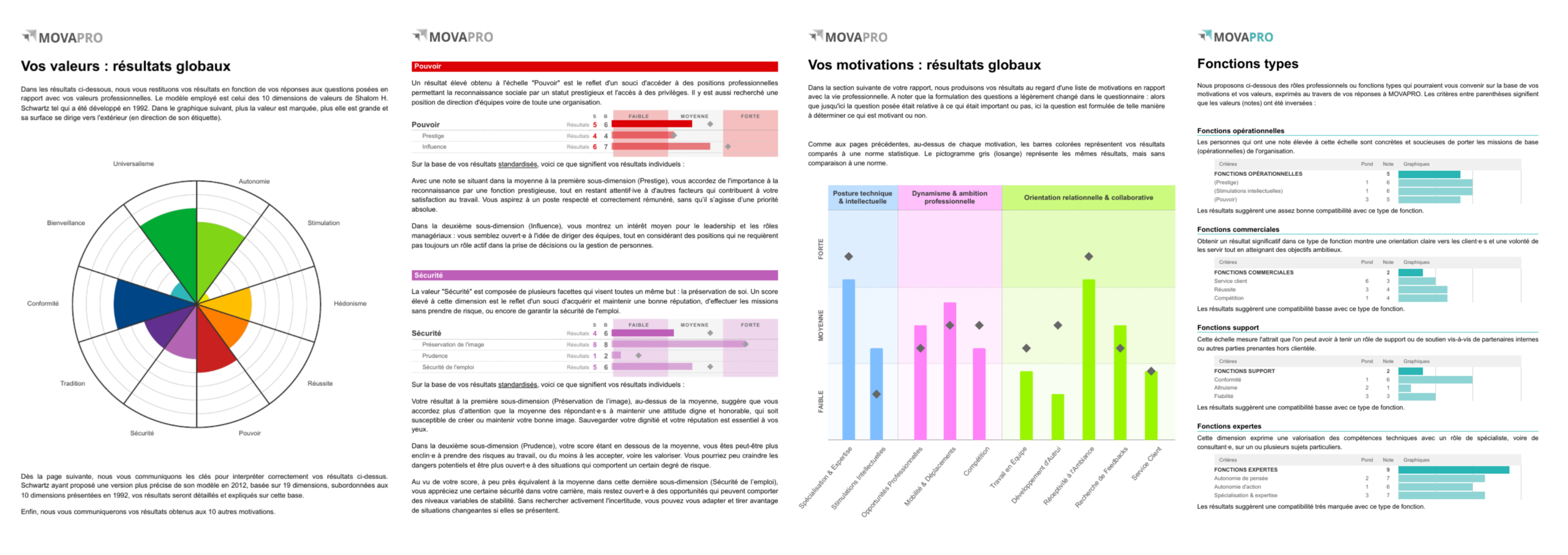 MOVAPRO vise à établir le profil de motivations et de valeurs des répondant·e·s, tel qu’il s’exprime dans le contexte professionnel, au travers d’un questionnaire au mode de passation original et robuste (identique à HEXAPRO), le rendant compatible avec une utilisation dans des contextes divers (sélection du personnel et accompagnement).