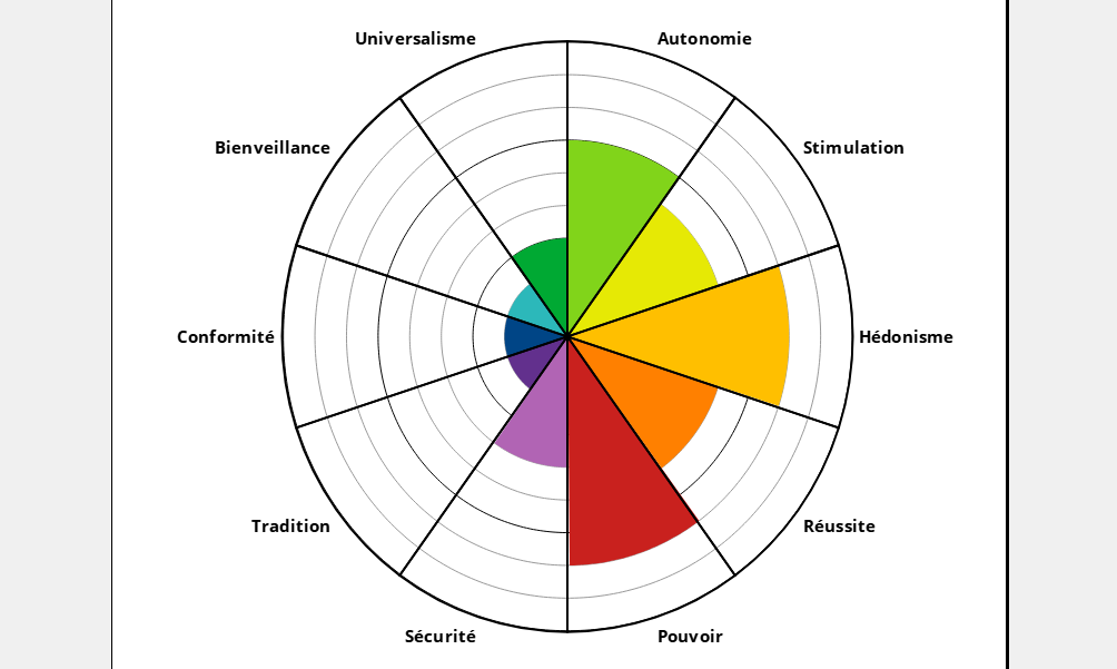 - une vision d’ensemble des résultats distribués dans 10 dimensions de valeurs (et 18 sous-dimensions), et 10 dimensions motivationnelles ;